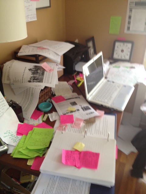Is it truly chaos though? I can actually understand the archaeological layers here, representing a revision process that began way back in March. I can tell you the green pages are notes from a conversation with my editor. Dark pink post-it notes represent major problems, and ideas for fixing them. Pale pink = quick fixes. Yellow = placeholders in the print out of the manuscript. The photocopies lying around are articles taken from my once-organized research binder, information I needed to have at my fingertips. Oh, and the bowl? It had chocolate caramels with sea salt.