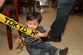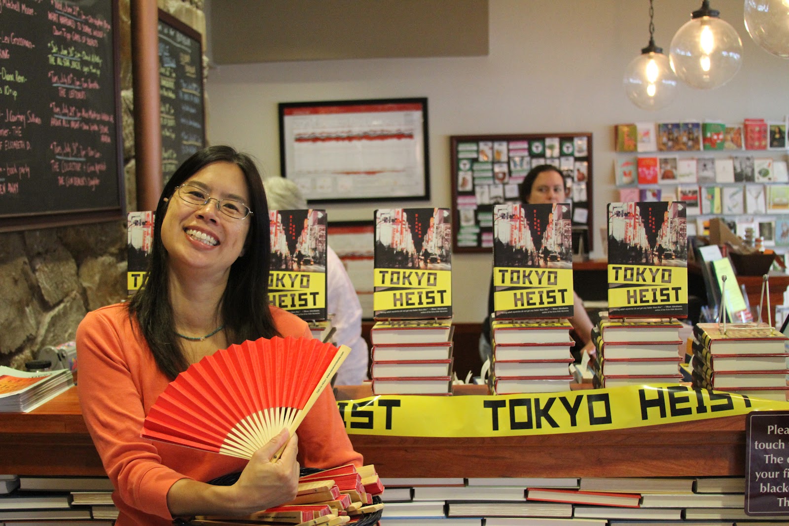 The store owners, Jaime Clark and Mary Cotton, could not have made me feel more welcome, and they graciously let my partners in crime vandalize — uh, I mean decorate — the store. Fellow Apocalypsie Gina Rosati did an amazing job stringing up yellow crime scene tape everywhere, which makes me wonder about her pre-author life. Perhaps she worked in law enforcement. Perhaps she has a checkered past. We put out Japanese candies (these were quickly devoured!), swag, and a raffle for some door prizes: gift bags with Japanese goodies. My friend and fellow author Julie Wu handed out red paper fans.