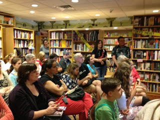 Saturday afternoon was the launch party at Newtonville Books, another one of my favorite local bookstores. We had a great turnout — a nice mix of family, friends, fellow writers (several Apocalypsies!) and people I did not bribe or strong-arm into coming. In other words, some people off the street! I was most delighted to see kids — actual teenagers and some pre-teens — coming into the store. We had around 20 I think. It’s been a dream of mine to see more young people come to author events like readings and book launches, so I was beyond happy when I peeked out of Mary’s office and saw so many people under 18.
