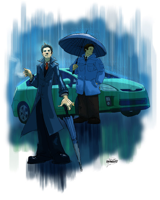 I think Rich perfectly captured what I had in mind when I dreamed these guys up, and I love that they captured his imagination as an artist. Also love the colors in this picture, the feeling of Seattle damp and gloom, and the sense of intrigue.
