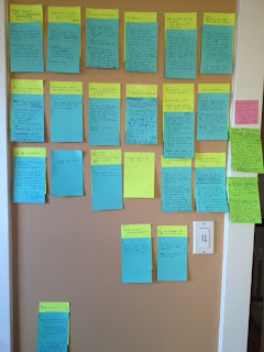 See the blank yellow one? There’s a setting with nothing going on. See the blue one by itself? That’s a scene with no setting. Mapping this out in advance helps me to plan my scenes more effectively.